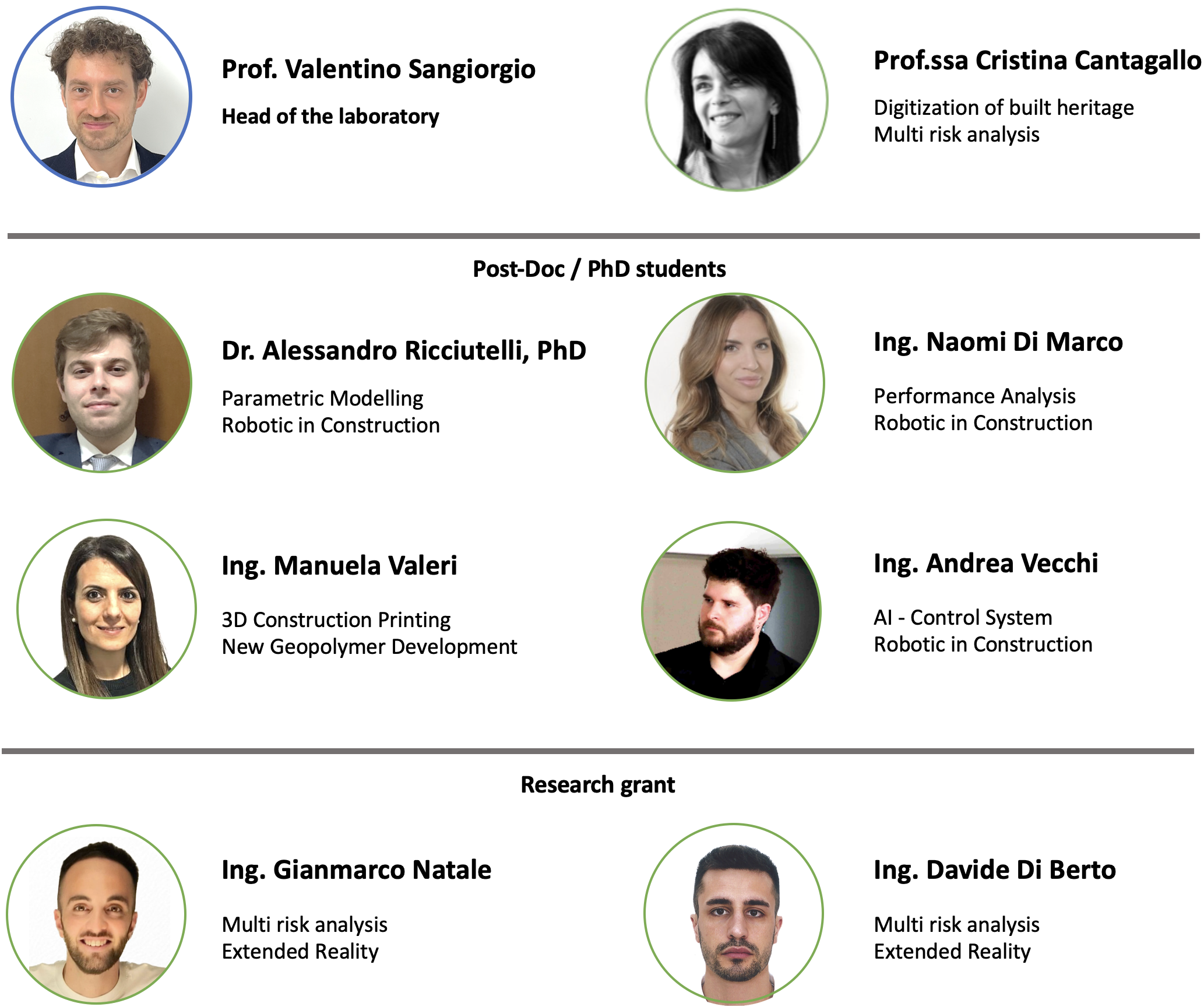 Gli ambiti di ricerca riguardano: Fabbricazione digitale; Modellazione 3D e analisi multi-perfromance anche supportate da intelligenza artificiale (analisi strutturali, termiche e acustiche, ottimizzazione, Life Cycle Assessment) e sviluppo di nuovi materiali e componenti edili.